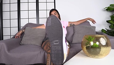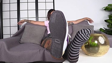 This web site contains sexually explicit material:Who says that a MILF can't channel her inner young self and express it through clothes? Diana Zili is no exception to that. Donning a pastel top, denim skirt, sparkly socks, and sneakers, she's no ordinary babe to mess with. The tattooed oldie ditches the show, huffing the nasty scent from the socks. To completely enjoy the reeking aroma, Diana laid the long feet and flaky soles bare. The pair of flippers isn't the only teasing part of it, but the peeking burgundy thong that the brunette MILF takes off after. While crimping the untrimmed toes, she plays with the shaved pussy, fondling the throbbing clit as well. Then, Diana exposes a big suckable pair of tits, glazing the nipples with spit, before doing the dirtiest part of the tease—piss play. Without hesitation, the pierced strumpet makes a piss rain over the plant inside the fishbowl. She makes a mess on the marble floor, smearing the drips of urine using Diana's pads.