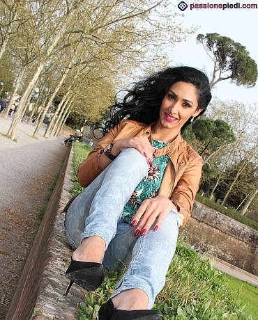 This web site contains sexually explicit material:With her long, curly black hair, sexy dark eyes, bright smile and perfect body, Alexya looks hot as fire even without showing much skin. She oozes sex appeal and looks stunning in a light brown leather jacket teamed with a printed silk shirt, form-fitting jeans and a fabulous pair of black pointed-toe pumps with eccentric, sky-high heels. Alexya’s feet are so sexy, with little toes painted with burgundy polish.